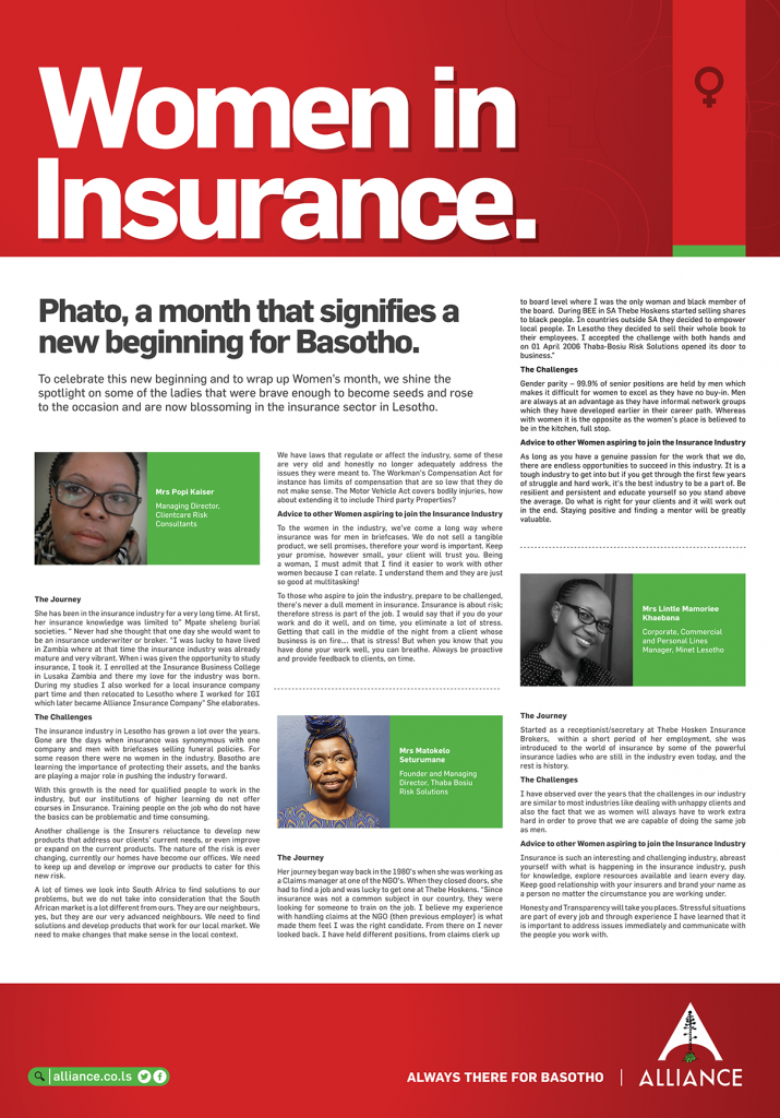 To celebrate this new beginning and wrap up Women’s month, we shine the spotlight on some of the ladies that were brave enough to become seeds and rose to the occasion and now blossoming in the insurance sector in Lesotho.