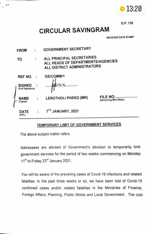 In a circular savingram today the GS said government services have been put to a halt in the face of the prevailing Covid-19 infections and fatalities.