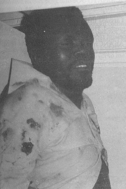 At 6am when we went around we found sheets tied together from the third floor window, swaying in the slight breeze, at the bottom was a pool of blood and many cartridges. Gene must have jumped and broken his leg and must have been groaning in pain when the three SADF found him. His body in the mortuary was peppered with many open bullet wounds. Comrades who bathed him later said his body had more than 30 bullet wounds.