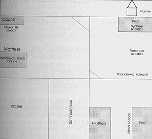 “FOR FOUR WHOLE DAYS THEY LIVED AS A FAMILY”, sobbed Nellie whom we found on the morning of the 9th sitting on the side of the road with Yolande (10 months) on her lap. 4 days on a double bed slept Alfred and Nellie with Pumeza, Monde and Phumelane on a mattress on the floor in the same room. In the living room, Mzukisi Thandiswa, Florence and baby Yolande had gone to sleep on a couch and mattresses on the floor. With the front door bombed out, Nellie heard her daughter Thandiswa scream out, “Please mother keep my child safely.”