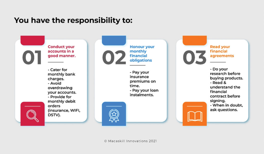 Often times, consumers visit FSPs (which includes banks, insurance companies and micro finance institutions) to buy products and services with the goal of enhancing the quality of their lives. Examples include taking personal loans to pay for school fees, buying cars via vehicle finance, taking out insurance policies to cater for funeral expenses or house contents cover etc. As a consumer of financial products, you have a responsibility or duty to honour the financial obligations you’ve agreed to, which consumers sometimes forget. I’ve read about cases where consumers made the decision to stop paying back their loans without discussing or informing their FSP, which is not good behaviour. In this article, I will discuss some of the obligations financial consumers have in the infographic below.