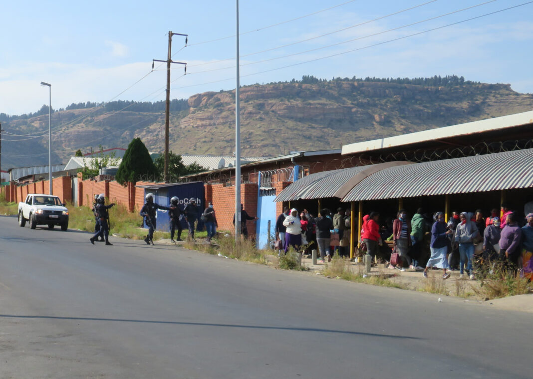 At least three people are reported to have been shot when members of the Lesotho Mounted Police Service (LMPS) opened fire on protesting textile factory workers at Ha Thetsane yesterday.