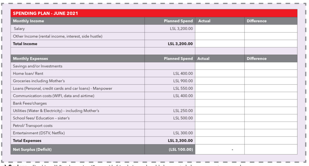 Using the template shared in the “How to create an exciting spending plan”, Tsietsi should consider the following:
